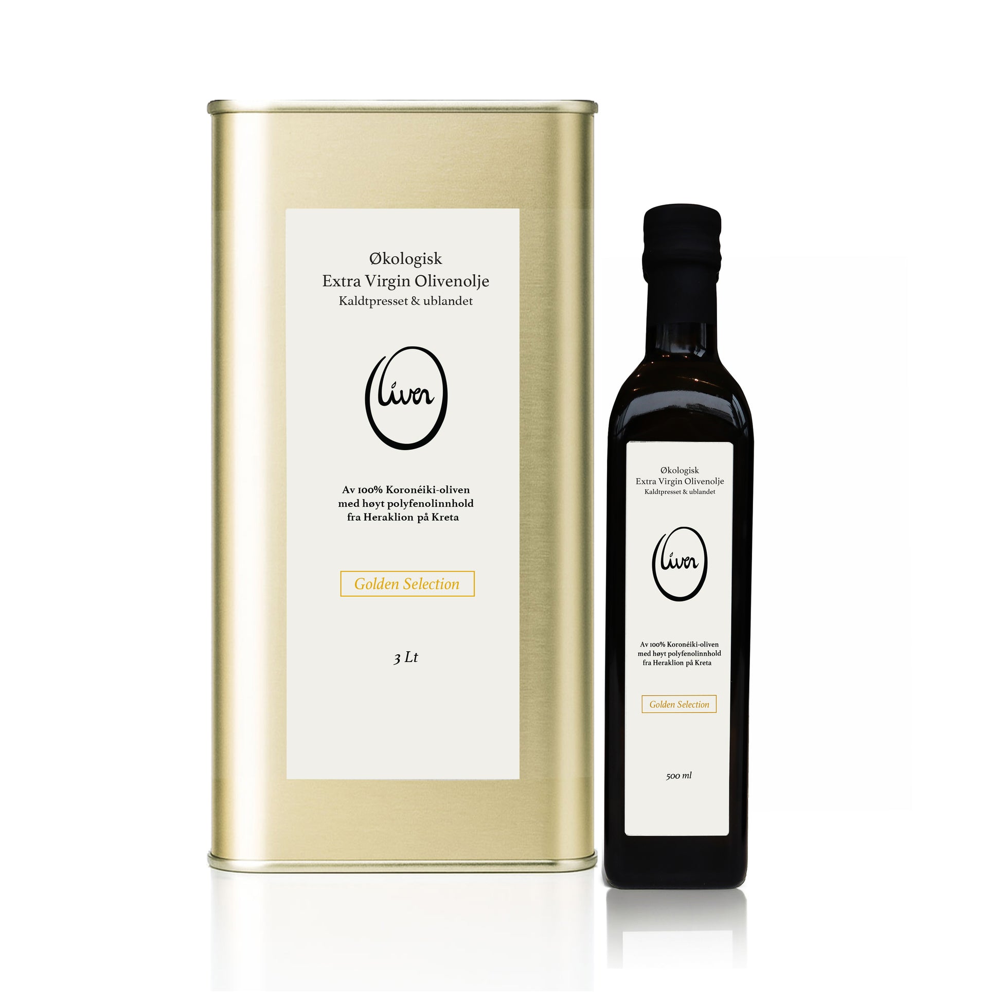 Oliven® Golden Selection Økologisk i to praktiske størrelser: Elegant 500ml-flaske til kjøkkenbenken og praktisk 3liters-boks for lagring og påfyll.