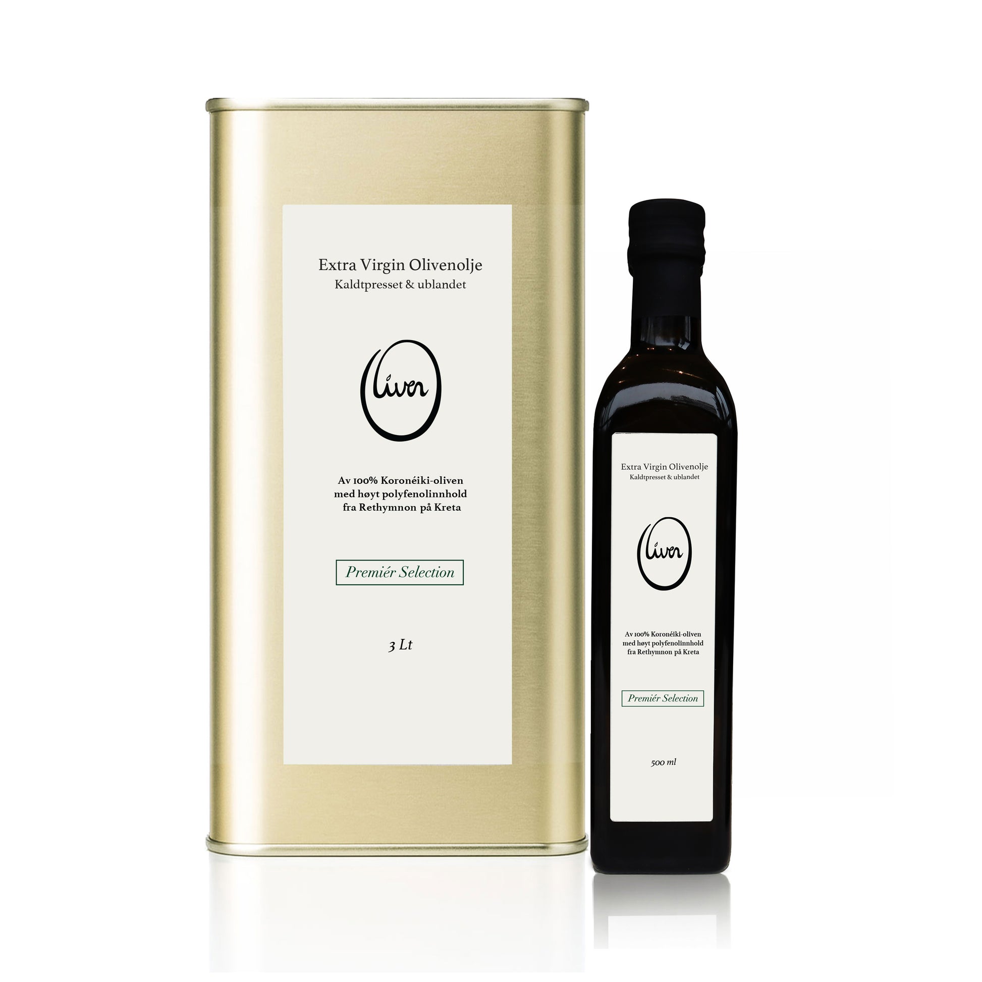 Oliven® Premiér Selection i to praktiske størrelser: Elegant 500ml-flaske til kjøkkenbenken og praktisk 3liters-boks for lagring og påfyll.